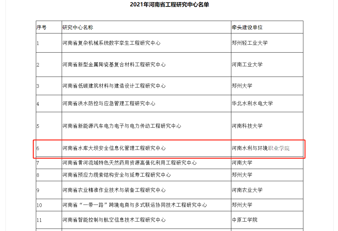 2021年12月14日,河南省发展和改革委员会发布2021年新建161家河南省工程研究中心名单,由副校长张凌杰教授主持申报,测绘地理信息学院、土木工程系、环境工程系、水利工程系等有关教师参与的“河南省水库大坝安全信息化管理工程研究中心”获批建设。