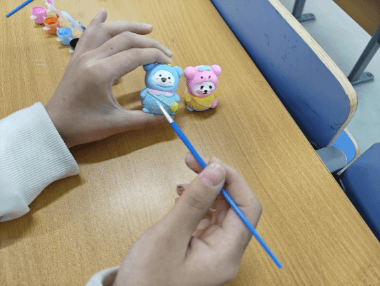 在“趣味DIY”环节,大家围坐一团,挑选心仪的发卡胚和石膏娃娃白坯开启创作。有人用奶油胶搭配小装饰,制作出创意十足的发卡;有人精心调色,为石膏娃娃绘出精美服饰与灵动表情。“巧扭妙趣”中,五彩扭扭棒在同学们手中化身灵动小动物、精美装饰品,创意无限。