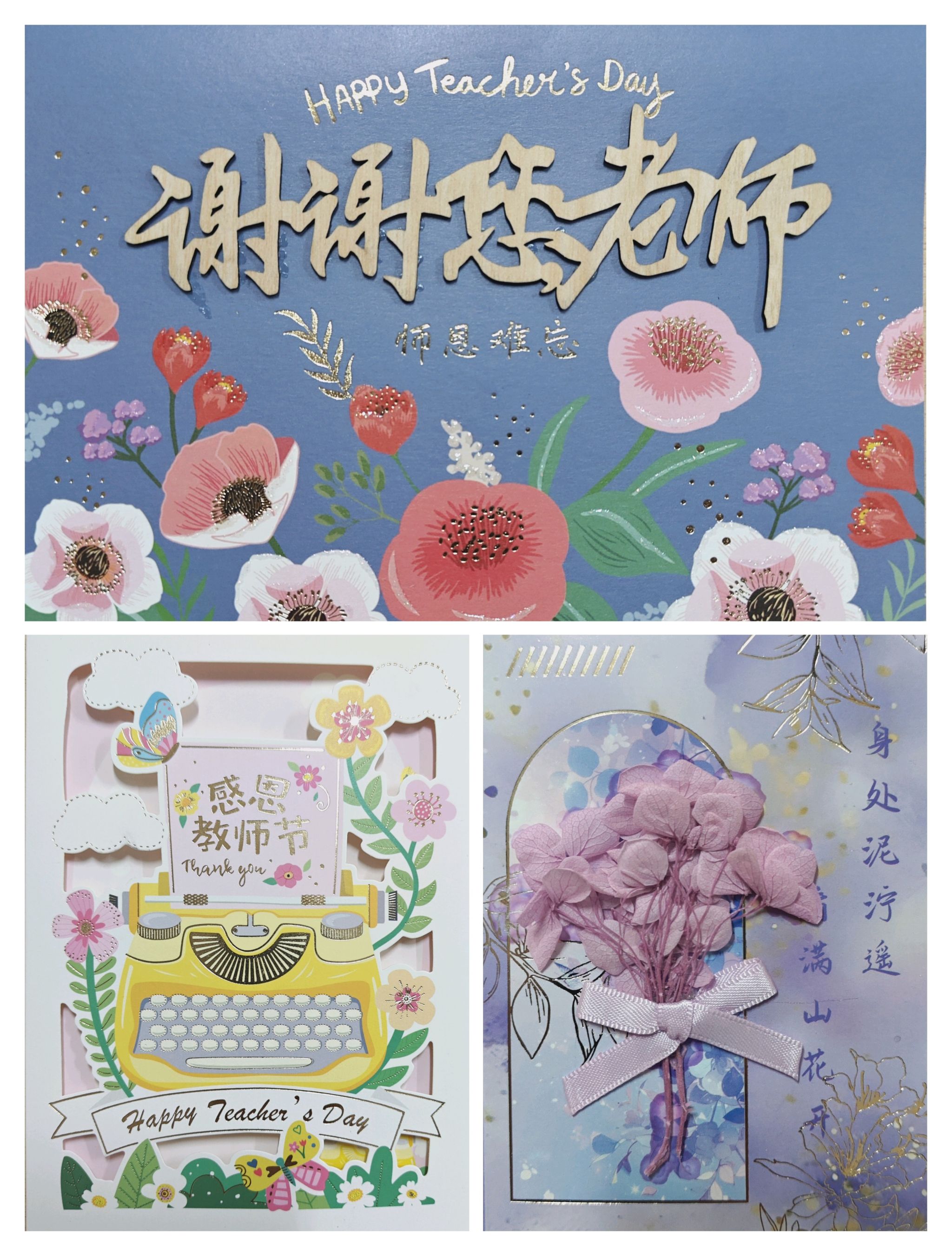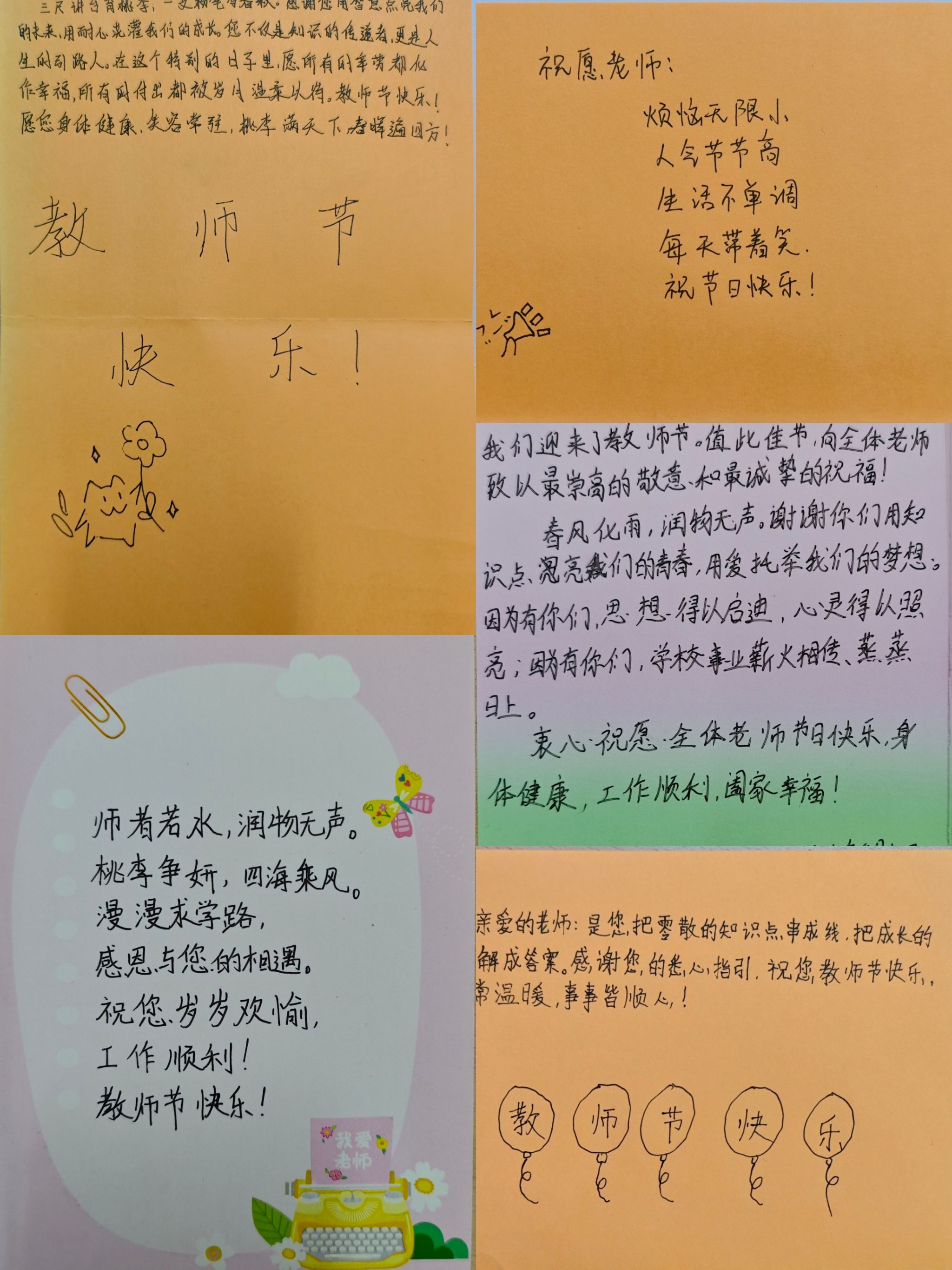 活动现场,几张长桌整齐排列,色彩清新的贴纸、设计雅致的贺卡以及不同颜色的签字笔错落摆放在桌面上,为同学们提供了丰富的创作素材。同学们怀着对老师的敬爱与感激之情,纷纷拿起手中的笔,在贺卡上倾诉衷肠。过程中,同学们全神贯注,神情专注而认真。他们时而抬头看看远处的展板,汲取灵感,时而低头继续书写,仿佛在与自己的内心对话。一张张贺卡,一行行文字,虽没有华丽的辞藻堆砌,却字字句句都饱含着同学们最纯粹的感恩与祝福,宛如潺潺溪流,滋润着老师的心田。