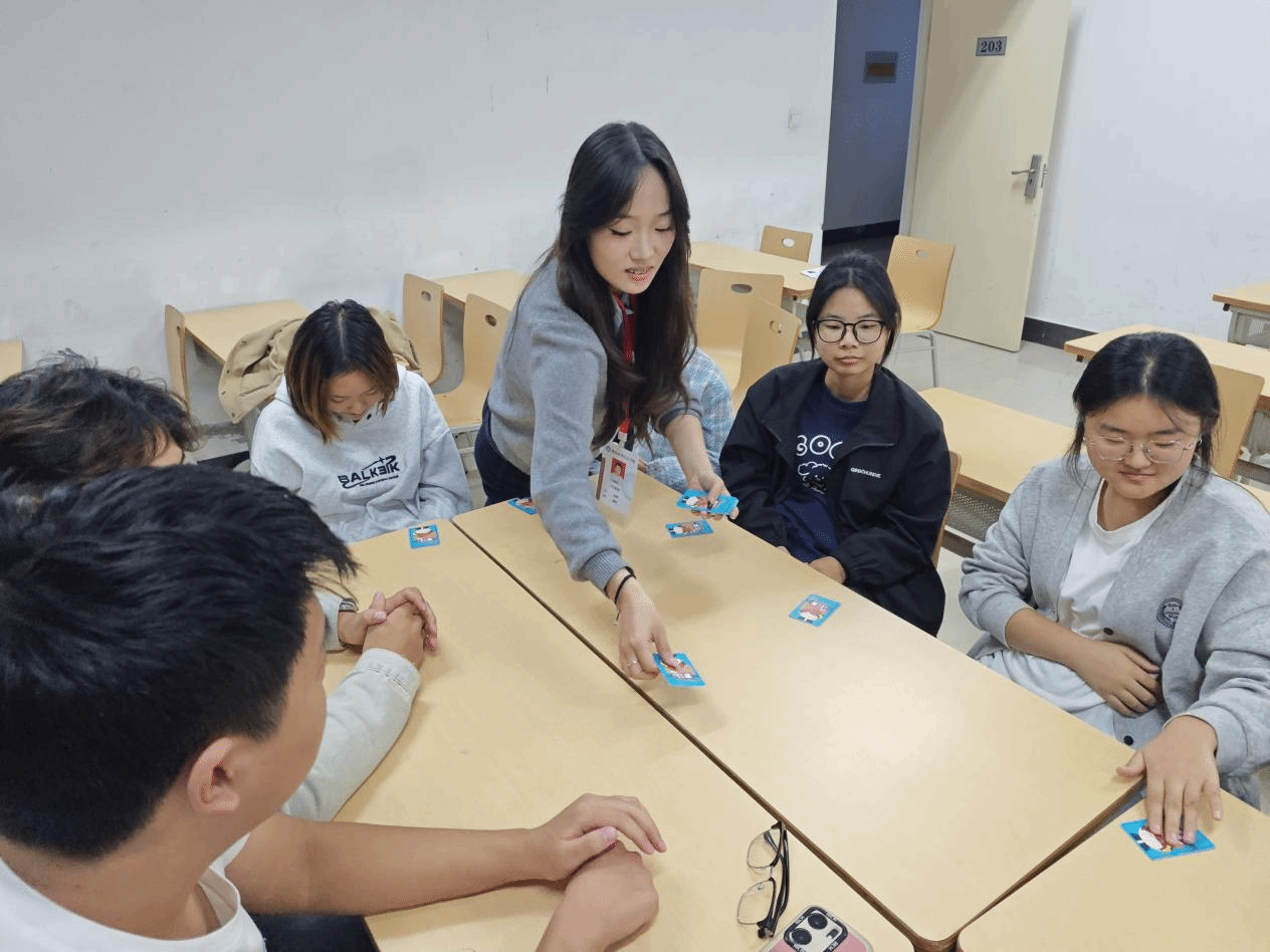 “校园寻宝”是系列活动的开篇项目。活动中,同学们自由组建3-5人团队,从工作人员手中领取初始线索后,便开启了校园探索之旅。本次活动的线索卡被巧妙布置在教学楼走廊、操场看台、图书馆台阶等校园各处,线索形式丰富多样,既有烧脑的文字谜题,也有暗藏玄机的图片提示。“狼局思辨趴”项目分为“狼人杀思辨对抗赛”与“害你在心口难开”两大环节。在狼人杀比赛中,同学们化身狼人、村民、预言家等经典角色,在主持人的引导下,围绕“身份真伪”展开激烈辩论。在“害你在心口难开”环节,每位同学头顶印有禁忌行为的卡片,在不知情的前提下需避免触发“雷区”,现场笑声此起彼伏。“青春跃动”项目聚焦户外协作,80名学子走出宿舍,在操场开启了“协力前行”、“数字抱团”趣味活动。“协力前行”中,同学们两人一组绑定脚踝,起初步伐错乱,经过反复磨合,大家逐渐从“各走各的”实现“同频前进”。“数字抱团”中,当主持人突然报出“7”的数字时,原本分散的学子瞬间向中心聚拢,有人主动牵起陌生同学的手组成团队,有人快速计算人数补位,陌生的距离在瞬间被打破。