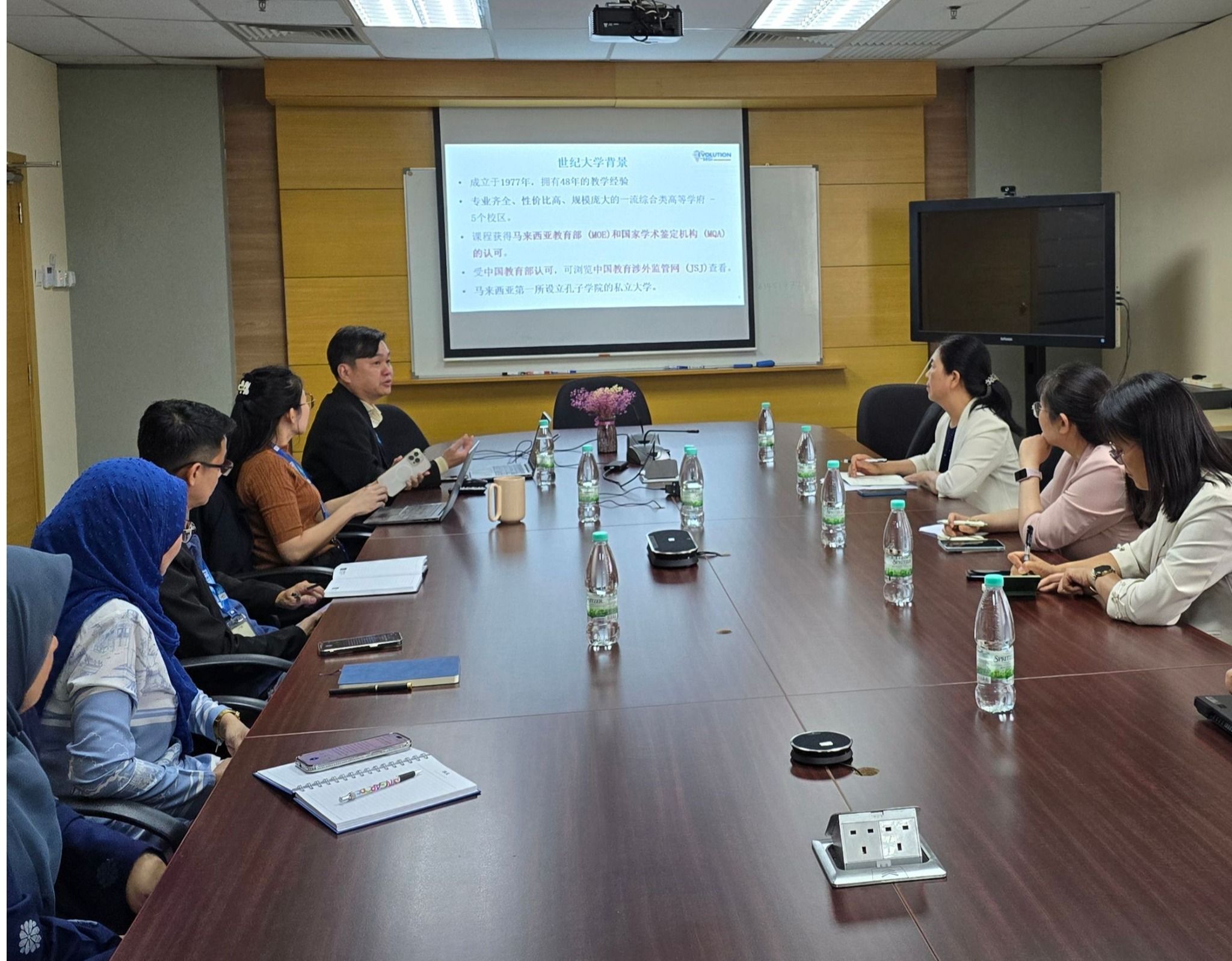 6月24日,代表团首站访问马来西亚世纪大学。双方围绕现有中外合作办学项目运行情况展开研讨,就项目前期存在问题以及课程衔接、师资互派、学生联合培养、课程资源共享等议题进行了深度交流。会谈明确了进一步探索“双导师制”人才培养机制和“学期交换+寒暑假游学”交流路径,为两校学生深造搭建国际化学术平台。期间,代表团实地考察了该校实训室,重点了解其实践教学体系构建模式,共同推动双方合作办学项目走深走实。