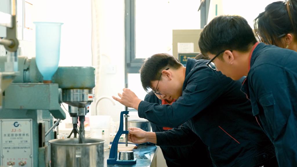 11月12日,设立在水利工程系的河南省水利第一工程局检测分公司内,青年教师正带领学生一起进行混凝土检测,在实际生产项目中提升实践技能。