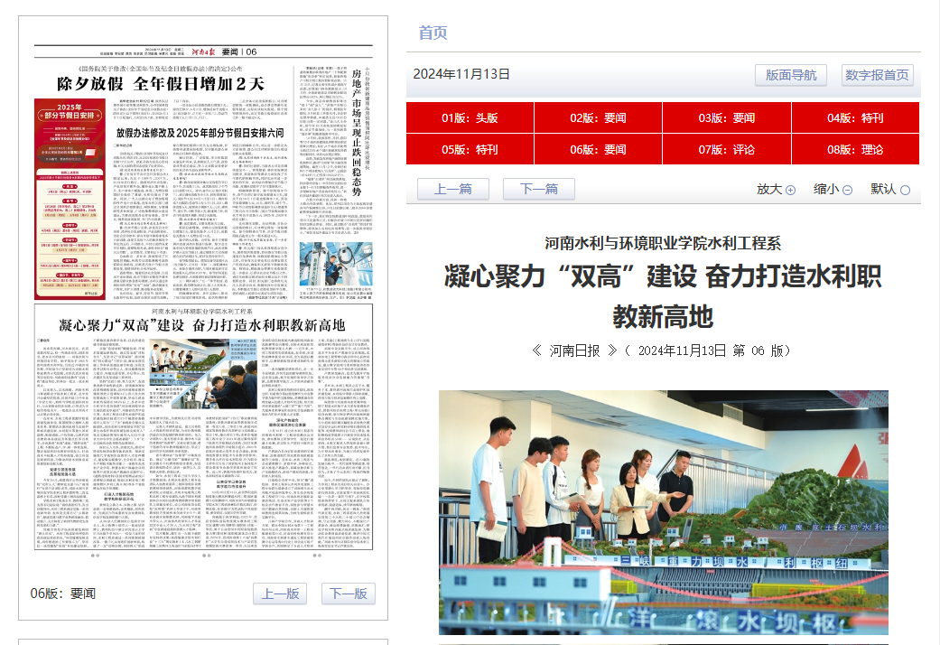 11月13日,河南日报06版以《凝心聚力“双高”建设 奋力打造水利职教新高地》为题,对taptap点点水利工程系工作亮点进行报道。
