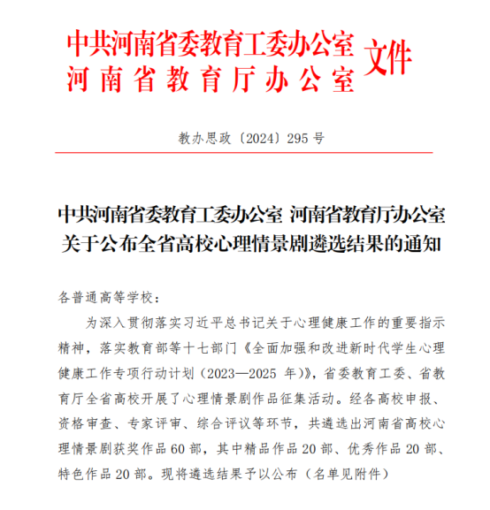 9月27日,省委教育工委、省教育厅办公室公布了“2024年全省高校心理情景剧作品征集展演活动”入围名单,taptap点点选送的心理情景剧作品《内心的世界》获选2024年河南省高校心理情景剧特色作品,实现了taptap点点在全省高校心理情景剧大赛中的新突破。