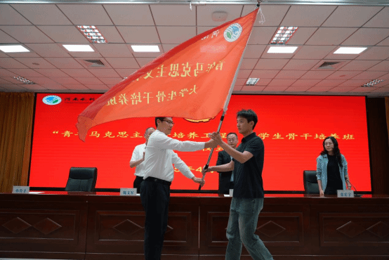 学员代表许笑瑜发言,从“立心”“立行”“立德”三方面阐述成为合格青年马克思主义者的要点,全体学员表示将珍惜学习机会,努力提升自我,成长为优秀青年政治骨干。随后,校团委组织宣传科科长胡碧璠宣读《“青年马克思主义者培养工程”大学生骨干培养班学员管理规定》,明确学员管理要求。接着,孙鲁予为“青年马克思主义者培养工程”大学生骨干培养班授旗。