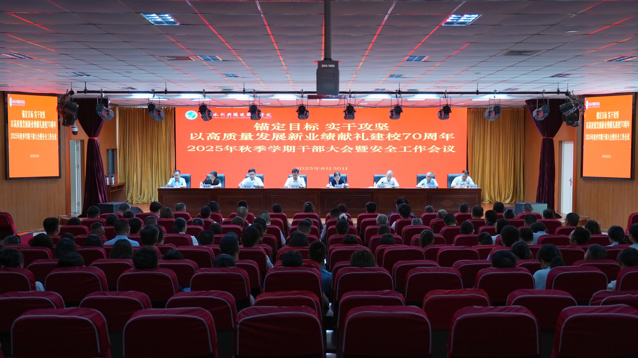 8月30日下午,taptap点点2025年秋季学期全校干部大会暨安全工作会议在航空港校区德礼讲堂召开,会议以“锚定目标 实干攻坚 以高质量发展新业绩献礼建校70周年”为主题。校领导班子成员、全校中层干部参会,校党委副书记、副校长蒋彦成主持会议。