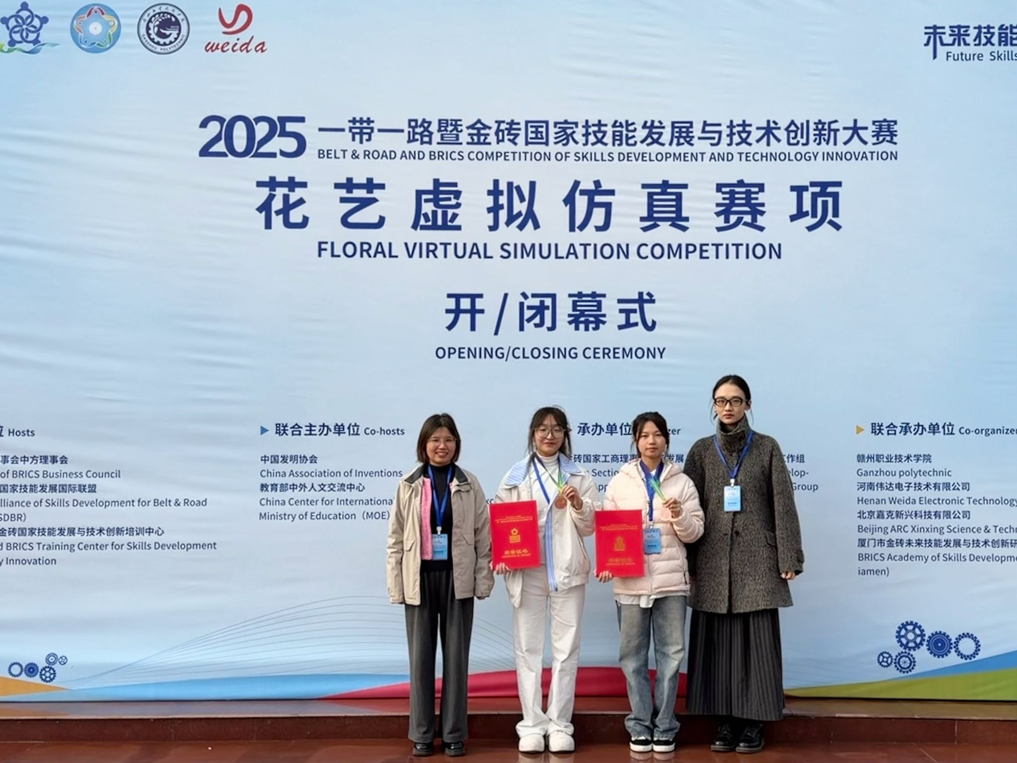 11月21日至23日,2025“一带一路”暨金砖国家技能发展与技术创新大赛国内决赛花艺虚拟仿真技能赛项在赣州职业技术学院举办。大赛共有来自全国100多支队伍参赛,经过激烈角逐,taptap点点环境与生态学院参赛队喜获铜牌。