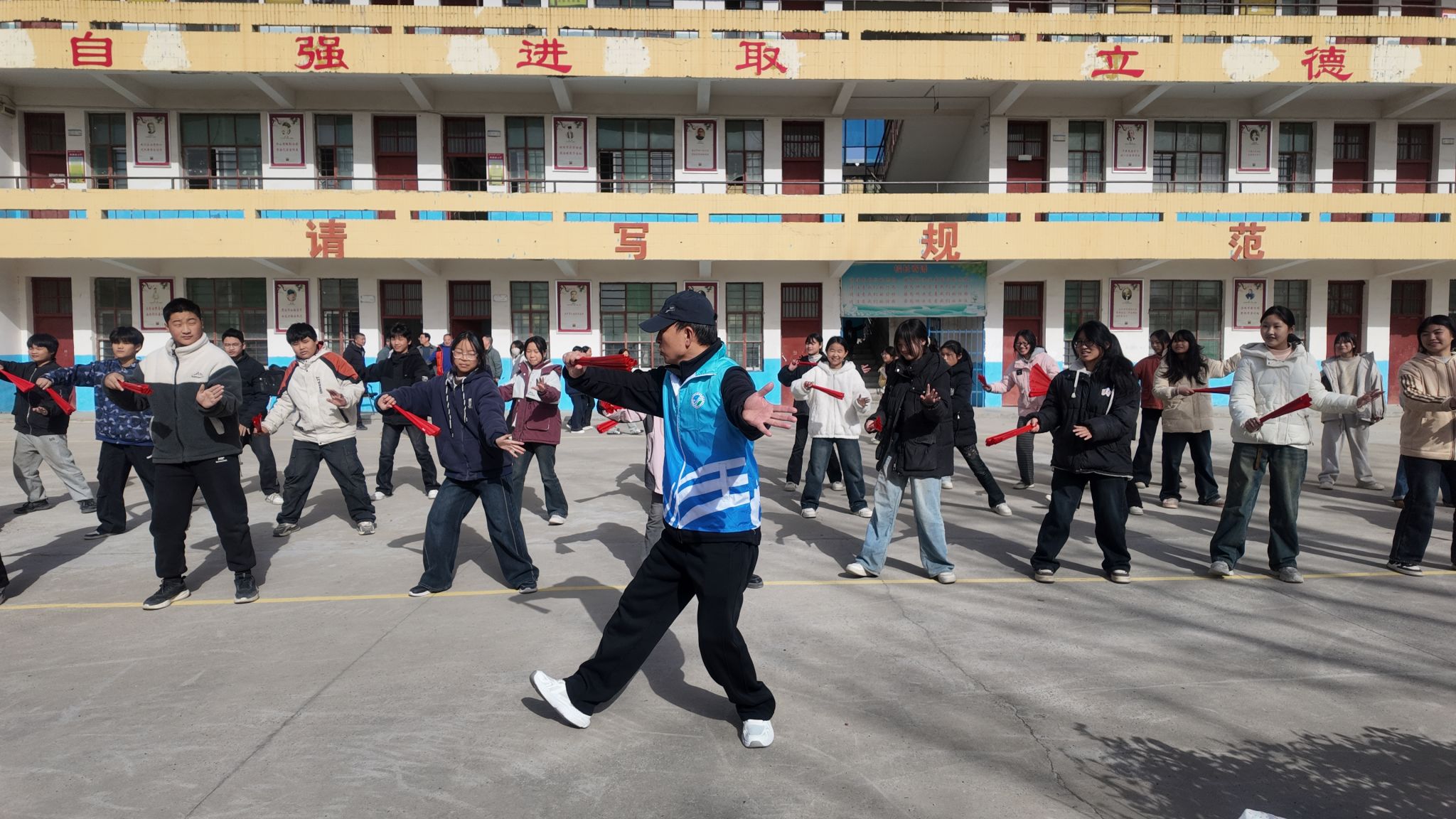 在东和店镇初级中学,传统文化与心理健康教育双线并行。体育教学部教师陈红岩与太极社团学生带领同学们学习《太极功夫扇》,通过热身操、功法教学与武术趣味游戏,让大家在一招一式中感受太极柔中带刚的韵味,体悟中华优秀传统文化的独特魅力。