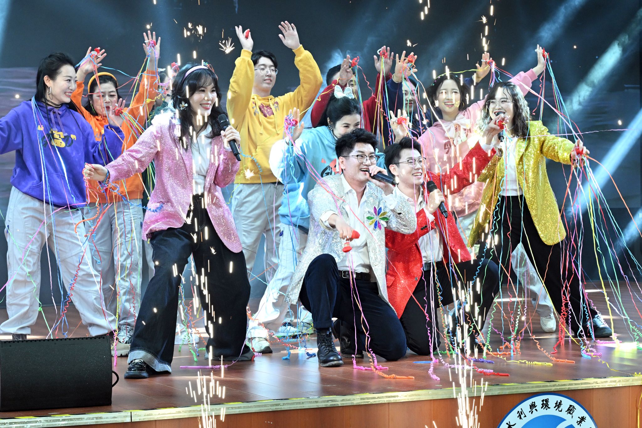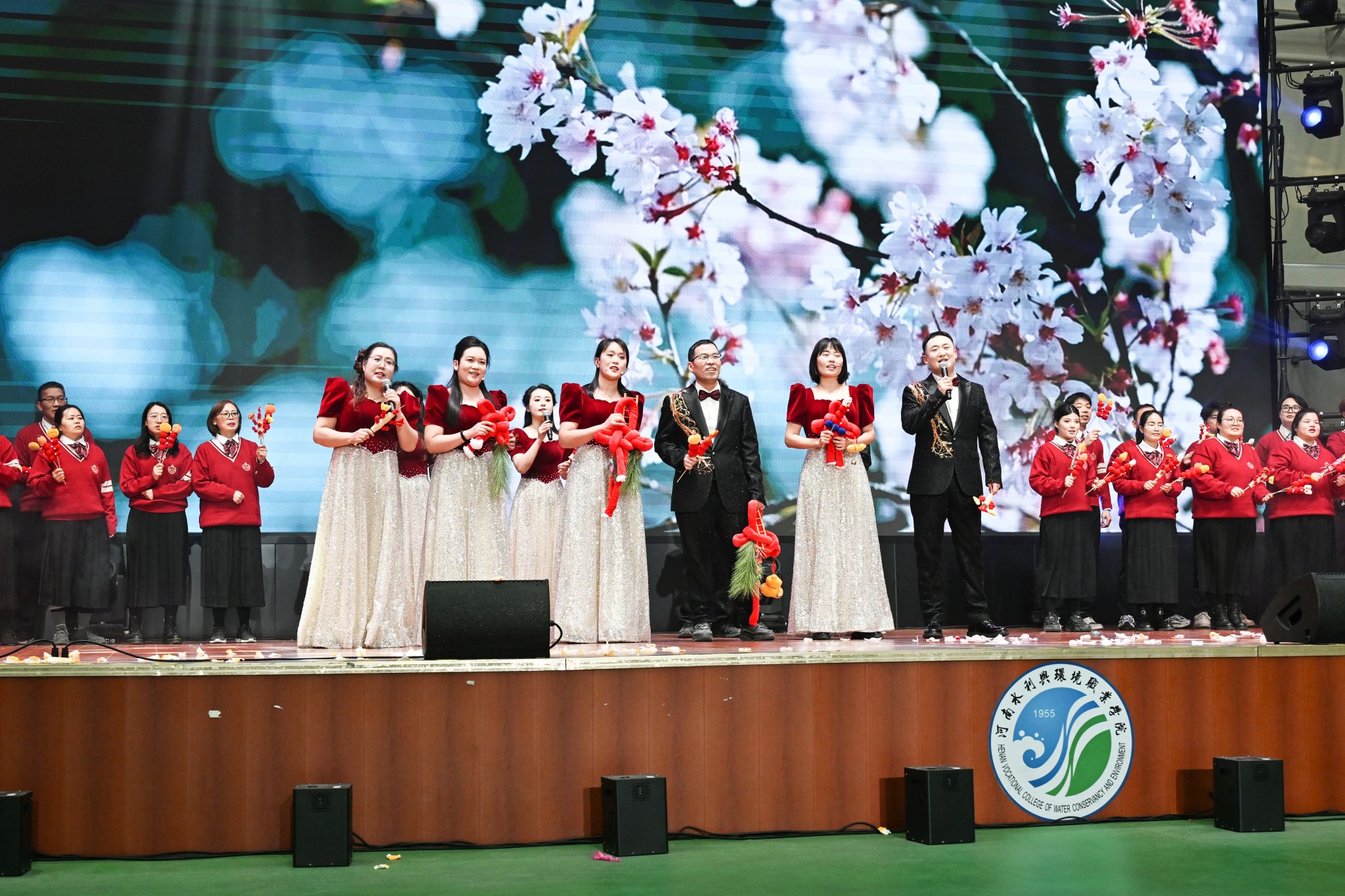 随后,校属各单位带来的合唱节目轮番登台,《红日》《花开盛世·舞动桃源》《我的中国梦》《NEW BOY》《青苹果乐园》《一路生花》《向快乐出发》等经典曲目接连唱响。熟悉的旋律、欢快的节奏中,教职工们精神抖擞、神采飞扬,踏着节拍舒展身姿,尽显青春朝气与蓬勃活力;台下观众情不自禁跟唱摇摆,全场欢歌笑语不断,礼堂化作欢乐的海洋,将联欢会氛围逐步推向高潮。
