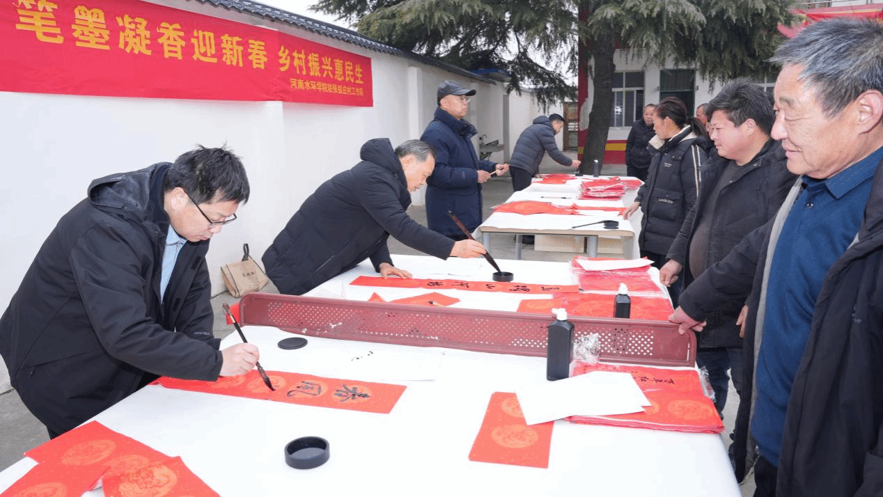 座谈会后,“迎新春·送春联”文化惠民活动在村部大院热烈展开。活动特邀中国水利书法家协会副主席李宪章、寒潮,理事兼河南省水利书法家协会主席胡建刚,理事李中飞现场挥毫。红纸铺展,墨香四溢,书法家们应村民之请,执笔书写下一幅幅寓意吉祥的春联和饱满的“福”字。“跃马扬鞭奔富路,迎春接福启新章”“乡村振兴驰骏马,民生幸福沐春风”……字里行间寄托着美好的祝愿。村民们手捧墨迹未干的春联,笑容洋溢,现场充满浓厚的喜庆气氛。