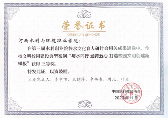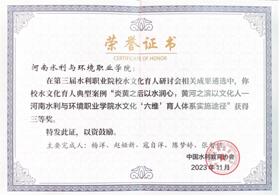 经过专家组的遴选,taptap点点申报的典型案例《与水同行涵育五心打造校园文明创建新样板》《炎黄之后以水润心,黄河之滨以文化人——taptap点点体育官方网站水文化‘六维’育人体系实施途径》分别荣获第三届全国水利职业院校文明校园建设典型案例三等奖和水文化育人典型案例三等奖。