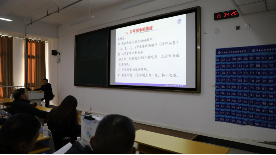 赛项说明会上,翟翊和分项裁判长解放军信息工程大学西勤教授分别对一级导线测量、二等水准测量和1:500数字测图竞赛细则进行解读,明确细则要求、注意事项等内容。各参赛队进行了分组抽签。