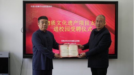 本次活动邀请当代武术家、陈式太极拳第十二代传承人陈冠军拳师到校指导活动开展。工会主席魏义军代表学校向其颁发了专家聘书,并举行了受聘仪式。仪式上,魏义军致欢迎词,表示学校高度重视非物质文化遗产太极拳项目学习普及,设立有非遗太极拳工作室,定期举办培训和有关活动,形成了良好氛围。希望通过武术家的专业指导,进一步提高校园太极拳水平,推动有关工作迈上新台阶。陈冠军表示非常高兴应邀参加活动,将大力支持学校太极拳项目的推广普及工作,帮助师生打好太极拳,传承武术精神,弘扬太极拳文化。