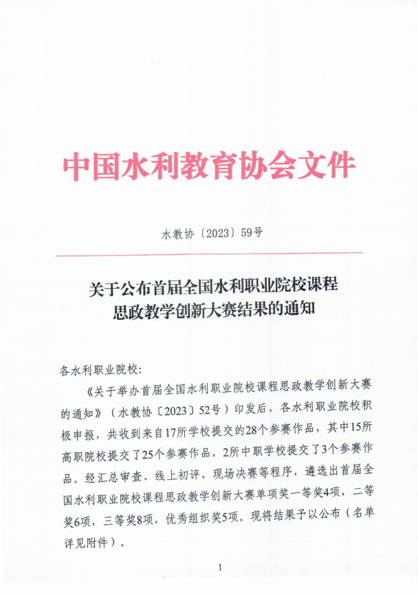 12月29日,中国水利教育协会下发《关于公布首届全国水利职业院校课程思政教学创新大赛结果的通知》水教协〔2023〕59号,taptap点点参赛作品《工程地质与土力学》和《上善若水之水力学》分别获得高职组二等奖、三等奖,学校荣获优秀组织奖。