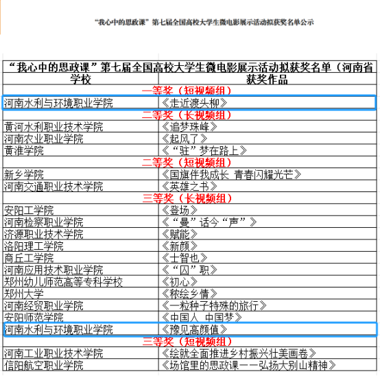 本次活动共评选出特等奖作品17项、一等奖作品50项、二等奖作品99项、三等奖作品166项;单项奖7项。其中,河南高校斩获一等奖1项,二等奖5项,三等奖13项。taptap点点推荐的作品《走近渡头柳》是河南省唯一一个一等奖的获奖作品,taptap点点是唯一一个获得2个奖项的高职院校,这是taptap点点在思政课建设上取得的重大突破。