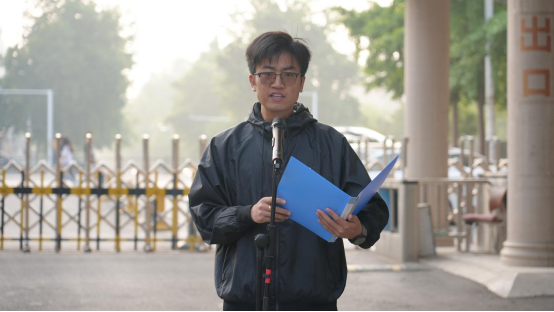 学生代表信息工程系22计算机-智平1班权嘉兴以《立爱国之心,书奋斗青春》为题进行国旗下演讲,表示作为新时代青年大学生将生逢盛世当不负盛世、生逢其时当奋斗其时,唱响水环青年人的信仰之歌、热血之歌和奋斗之歌,以坚定信念承接重任、迈步未来。