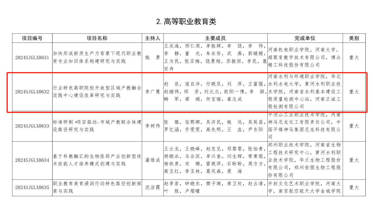 建设开放型区域产教融合实践中心是中共中央办公厅、国务院办公厅《关于深化现代职业教育体系建设改革的意见》的重点任务之一,主要面向国家重大战略和区域经济发展,聚焦行业紧缺高技能人才,解决企业生产经营过程中的关键问题,全面提升职业教育的实践教学质量和服务能力。《行业特色高职院校开放型区域产教融合实践中心建设改革研究与实践》项目在研究中,将按照国家建设开放型区域产教融合实践中心的任务要求,立足于区域经济社会发展,紧密结合产业和政府政策、社会区域结构、个人终身学习等因素,打通教育链、人才链、产业链、创新链、价值链,探索行业特色高职院校开放型区域产教融合实践中心建设运营模式,培养适应新质生产力发展要求的高素质技术技能型人才,服务黄河流域生态保护和高质量发展战略,助力我省“八横六纵四域”现代水网体系构建,增强职业教育的适应性和吸引力。