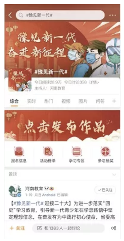 学生可在个人微博主页查看发布内容,或点击# 豫见新一代# 的关键词,跳转活动主页查看。也可继续发布内容,关注学校微博、关注教育厅微博等。