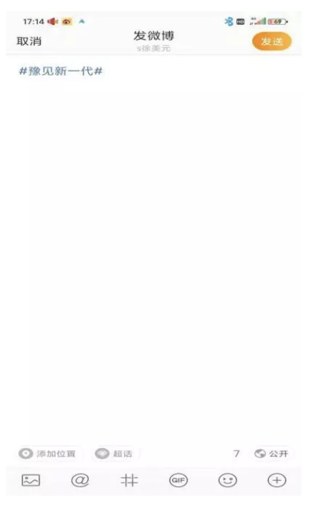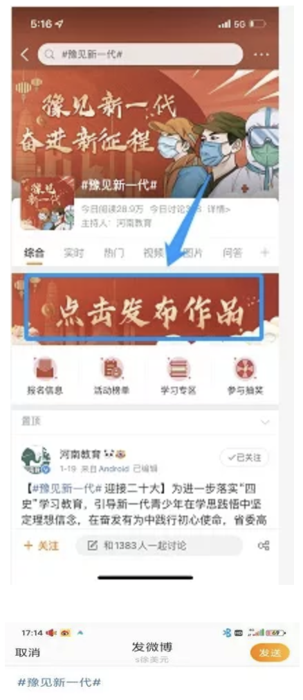 点击活动主页中的“点击发布作品”,或主页底部“和 XX 人一起讨论”,就可以自动带#豫见新一代#关键词,并发布内容(文字+图片或视频),然后点击右上角“发送”即可。(所有微博账号,无论是否未认证,均可参与评论。)