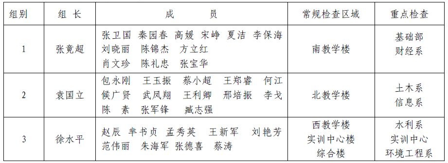 1.常规检查:本次集中检查分组进行,共分3组,分别检查南教和北教教学区、实验楼和实训中心教学区、西教和综合楼教学区,由组长负责记录检查人员及检查情况。分组如下:
