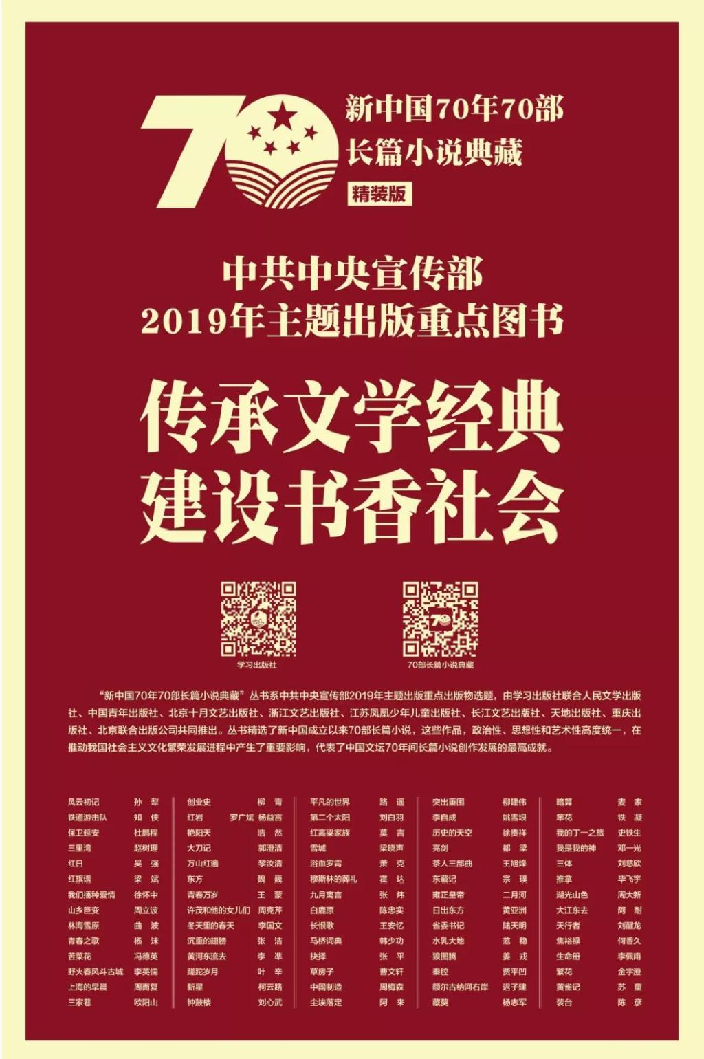 由中共中央宣传部2019年《传承文学经典 建设书香社会》重点图书在图书馆专架展出,供师生借阅。该套书是在中宣部出版局指导下,由文艺理论界和出版界的专家、学者组成编委会,完成作品的评审与选定。此次精选出了新中国成立以来70部长篇小说,这些作品,政治性、思想性和艺术性高度统一,在推动我国社会主义文化繁荣发展进程中产生了重要影响,代表了中国文坛70年间长篇小说创作发展的最高成就。每一本书不管是内容或者形式,都体现了中国文学、美学和出版的最高水准,旨在用中华人民共和国成立70年以来的文学经典来讲中国故事、传播中国声音、阐释中国精神、展现中国风貌。