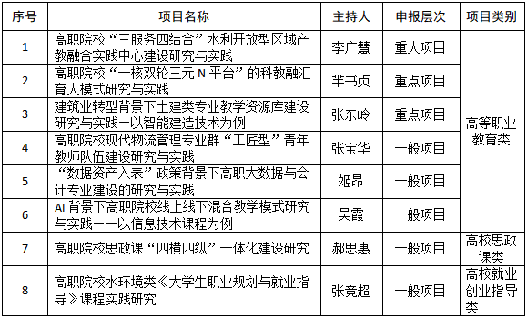 根据《河南省教育厅关于开展2024年河南省高等教育教学改革研究与实践项目立项工作的通知》(教高[2024]24号)相关规定和要求,经个人申报、部门初审、专家组评审,拟向省教育厅推荐《高职院校“三服务四结合”水利开放型区域产教融合实践中心建设研究与实践》等6个高等职业教育类项目和2个专项项目。现将推荐名单予以公示,自公示之日起5日内(2024年2月23日至2月27日)如有异议,请以书面、电话方式向教务处、纪检监察处反映或面谈。