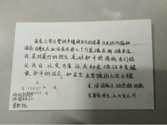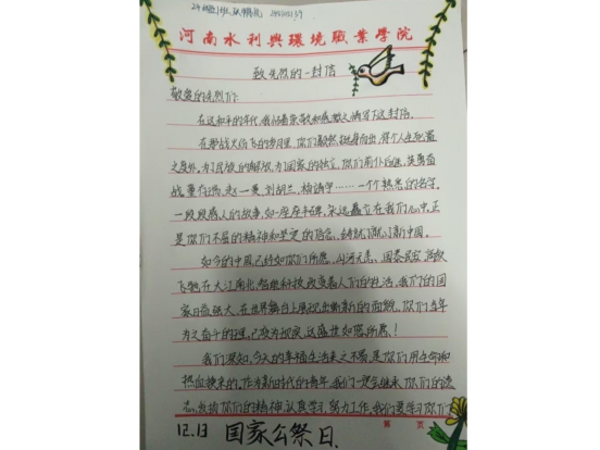大家围坐在一起观看历史纪录片,更加直观地了解历史,感受先烈的英勇事迹,分享自己所了解的历史故事,交流内心的感悟与体会。在思想碰撞中,同学们对革命先烈的崇敬之情愈发浓厚。12月13日,同学们的书信在纪念书信展览区进行了展示。一封封满载深情的书信,不仅是对革命先烈的缅怀与致敬,更是同学们内心情感的真实流露。