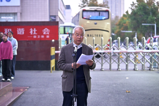 岳学超作国旗下讲话,他强调,青年是时代的潮头勇者,肩负着家国振兴的重任,要用行动回馈党和国家,为实现中华民族伟大复兴奋斗。他向全体同学提出三点希望:一是审视自我,找到毕生热爱的事,把人生的路走正;二是打开自我,遇见志同道合的人,把人生的路走宽;三是突破自我,锚定值得奔赴的目标,把人生的路走长。