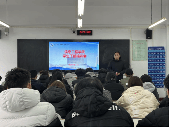 为进一步加强团学组织建设,提升学生干部素养,3月4日,信息工程学院召开学生干部培训会。学院党总支书记周颖琦主持并发表讲话,全体学管老师、团学干部参加。