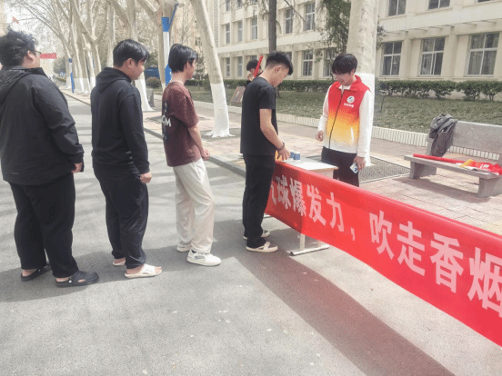 活动分为“气球运杯欢乐斗,告别烟草齐步走”气球运杯、“气球爆发力,吹走香烟瘾”气球吹杯、“告别烟草味,拥抱糖果甜”以“烟”换糖知识问答三项活动。活动现场,同学们或小心翼翼地将杯子运走,或奋力吹动气球,推动纸杯前行。每一次发力,都象征着对香烟瘾坚决说“不”,围观同学的加油声此起彼伏,将活动气氛推向高潮。在欢声笑语中,同学们既了解了禁烟知识,又收获了甜蜜糖果。活动最终评选出一等奖3名,二等奖5名,三等奖7名。