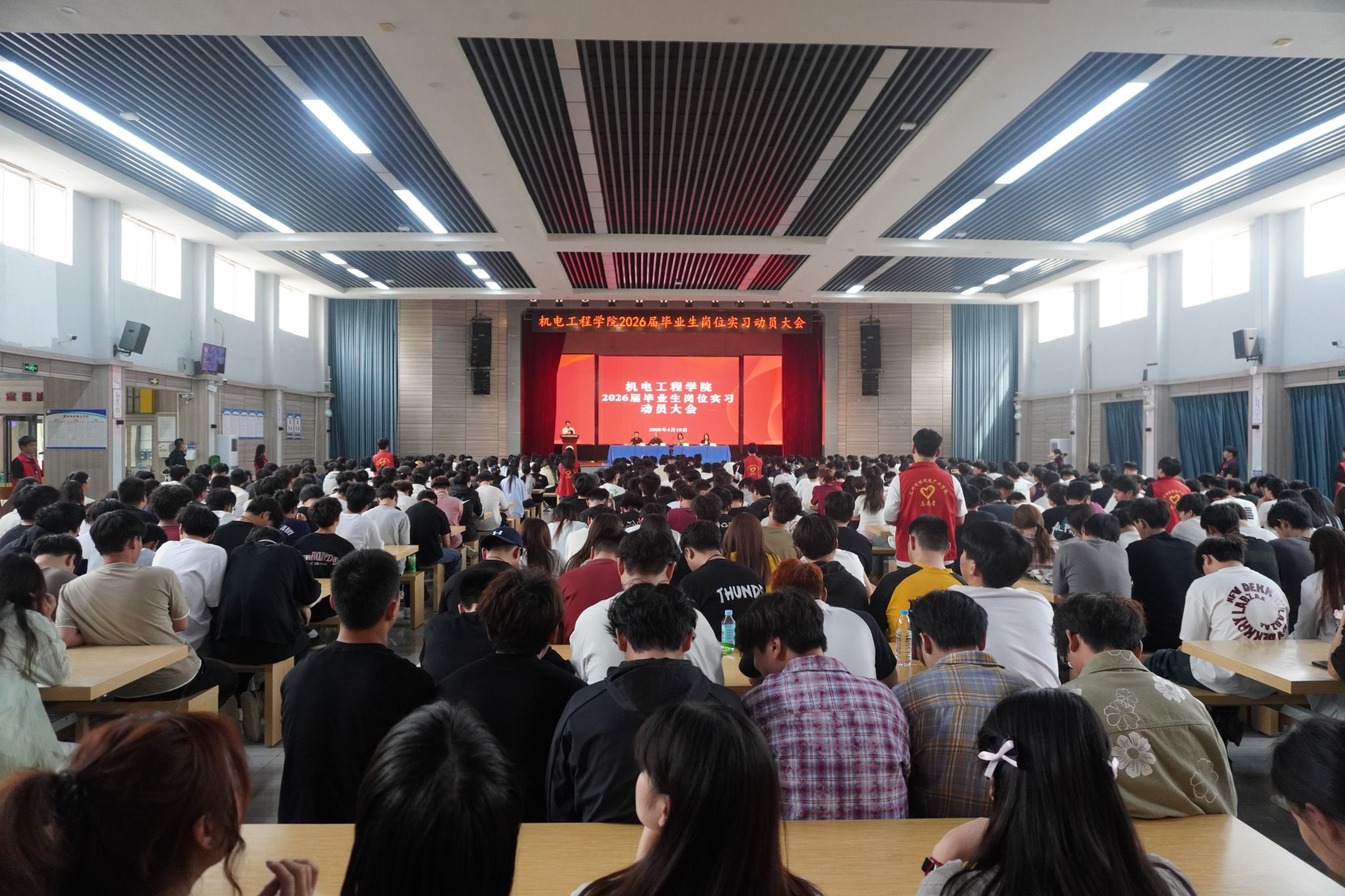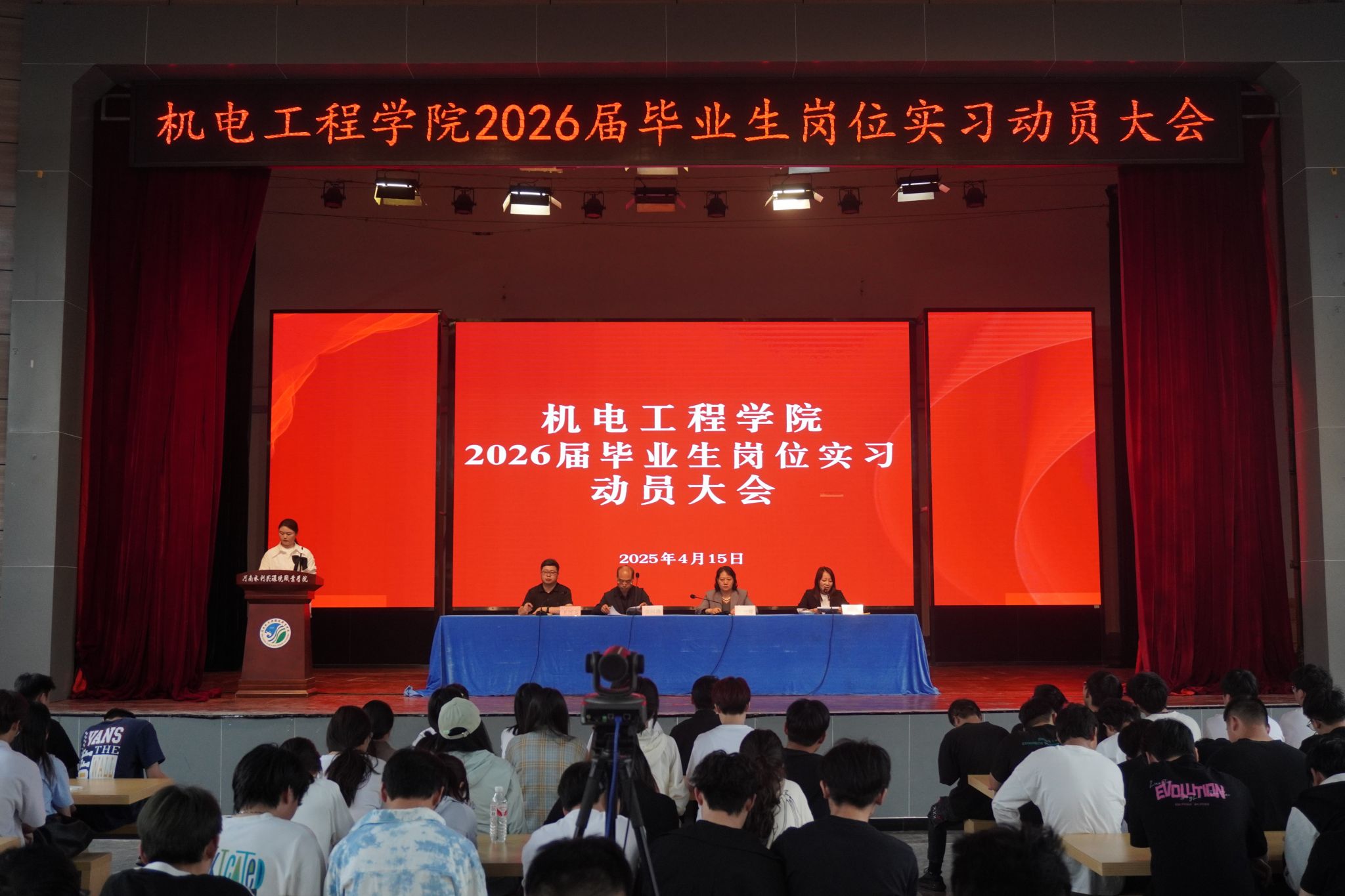 4月15日,机电工程学院在花园路校区南苑礼堂举行2026届毕业生岗位实习动员大会。学院领导班子成员、毕业班辅导员及23级全体学生通过线下参会与线上直播同步参与。