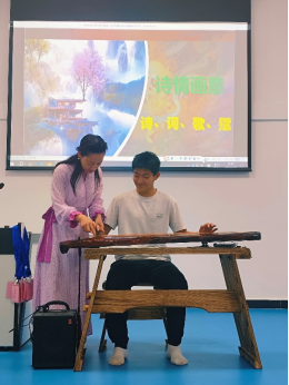 在实践教学环节,同学们通过"情景想象训练""音律同步体验"等专业互动项目,学习运用古琴音乐疏导情绪的技巧,通过基础指法练习,体验了"手应于心"的专注状态。学生表示,"指尖触碰琴弦的瞬间让人平静,仿佛嘈杂思绪被抚平。”