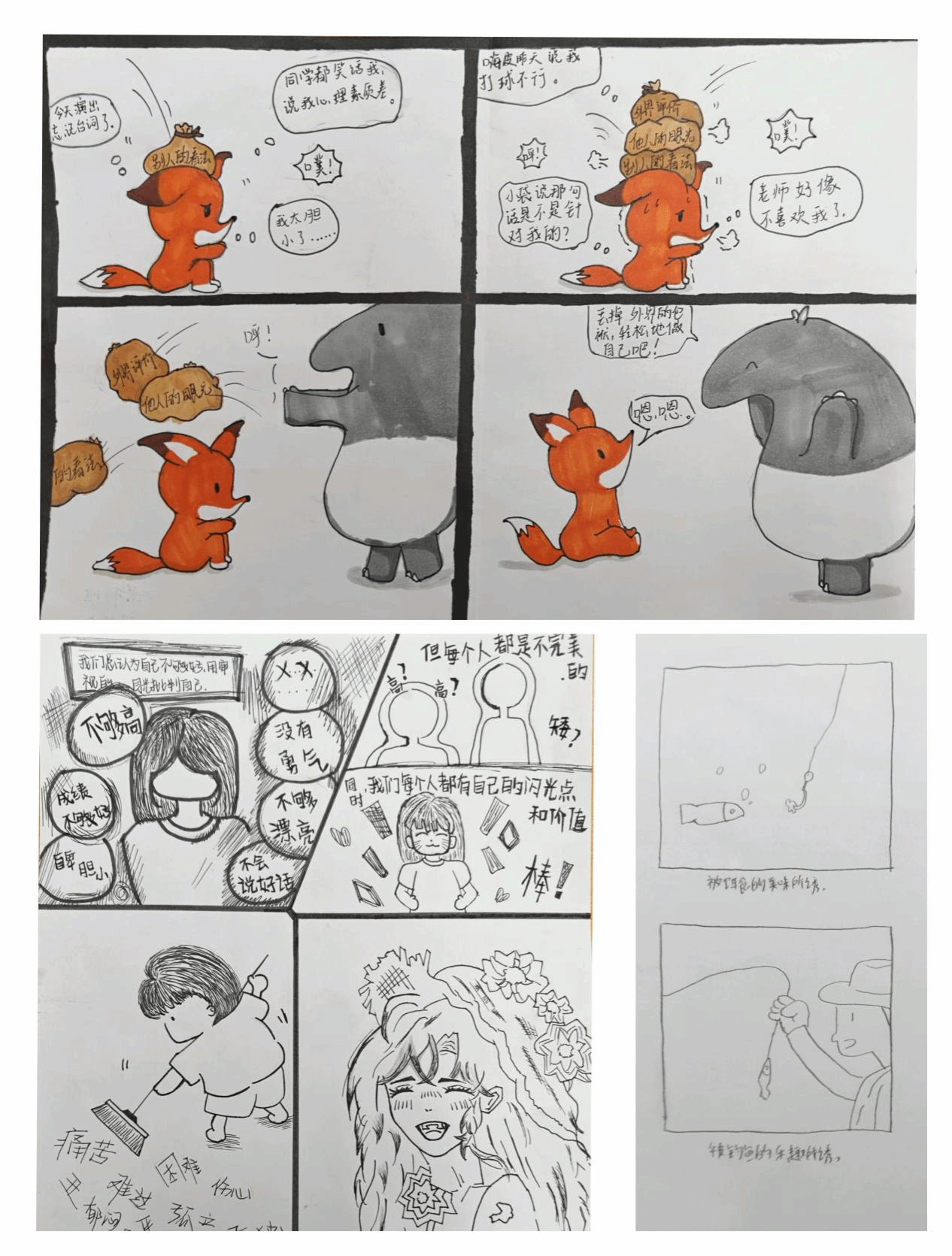 在“与压力和解,和乐观牵手”观影活动中,学生共同观赏励志电影《放牛班的春天》并撰写观后感分享感悟。“心灵疗愈,解忧焕彩”活动以“解忧调色盘”为主题,现场设置了情绪调色板、冥想流体画、解忧拼贴画等创意环节,同学们发挥创造力,借色彩表达情绪,通过创作和拼贴组合释放压力。“塑造心灵,手作治愈”活动以“我的情绪星球”为主题,同学们把喜怒哀乐融入手工创作,并分享情感故事。“生命之美,你我共绘”四格漫画创作活动中,同学们通过画笔展现内心世界,实现自我疗愈。