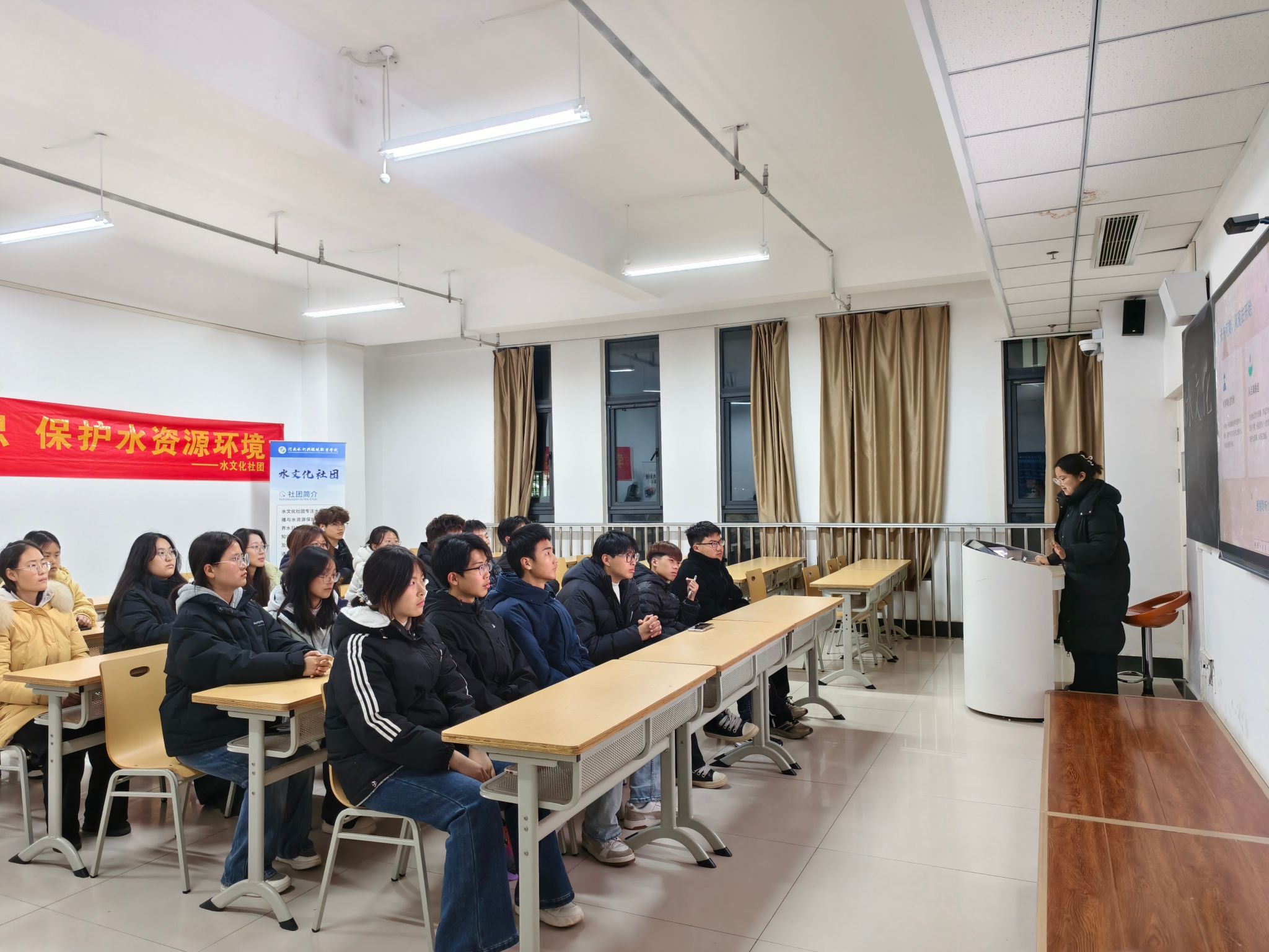 在互动交流环节,同学们踊跃提问,聚焦专业选择、发展前景及大学生活等话题。社团成员结合自身经历,耐心解答,真诚分享,现场气氛轻松而热烈,思想的碰撞激发了不少学生对水利事业的兴趣与向往。