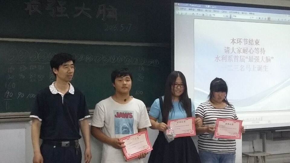 为丰富同学们的校园文化生活,激发大学生的创新思维能力,5月17日晚7:30,水利工程系在南教学楼205教室举办了首届“最强大脑”活动。