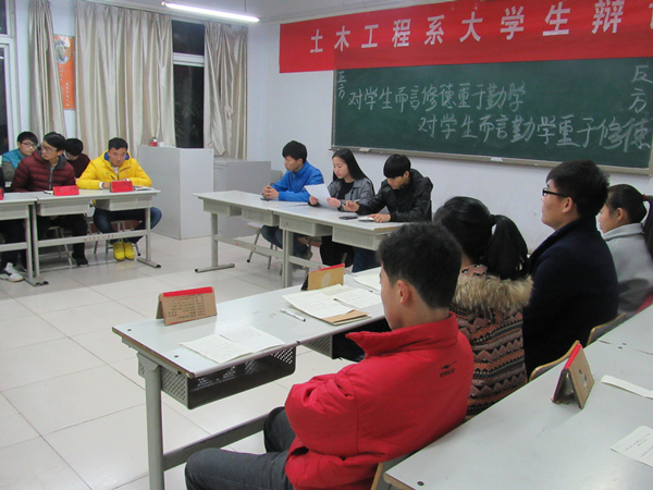 2015年11月11日至18日,土木工程系举行了2015级新生辩论赛,系学生会各部门部长担任评委,各班学生踊跃报名,热情参与,此次辩论赛吸引了同学们的广泛关注。