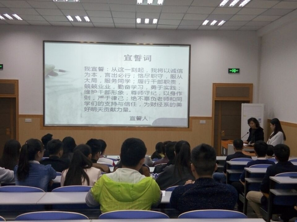 经济管理系于2015年10月23日在北教一阶举行了“2015—2016届学生会及团总支干部换届交接仪式”,系党支部书记陈锦杰,学管老师、辅导员及新老学生干部参加本次仪式。伴随着共青团团歌,本次干部换届交接仪式拉开了序幕。仪式上,陈锦杰书记宣布了新一届系学生干部的名单,上一届学生会会长、团总支副书记和新一届学生会会长分别进行了发言,新一届团总支副书记带领全体新任学生干部进行了宣誓。陈书记对本次宣誓仪式进行了总结发言,她在肯定上一届学生会、团总支工作的同时对新一届学生干部的工作提出了要求、做出了展望。