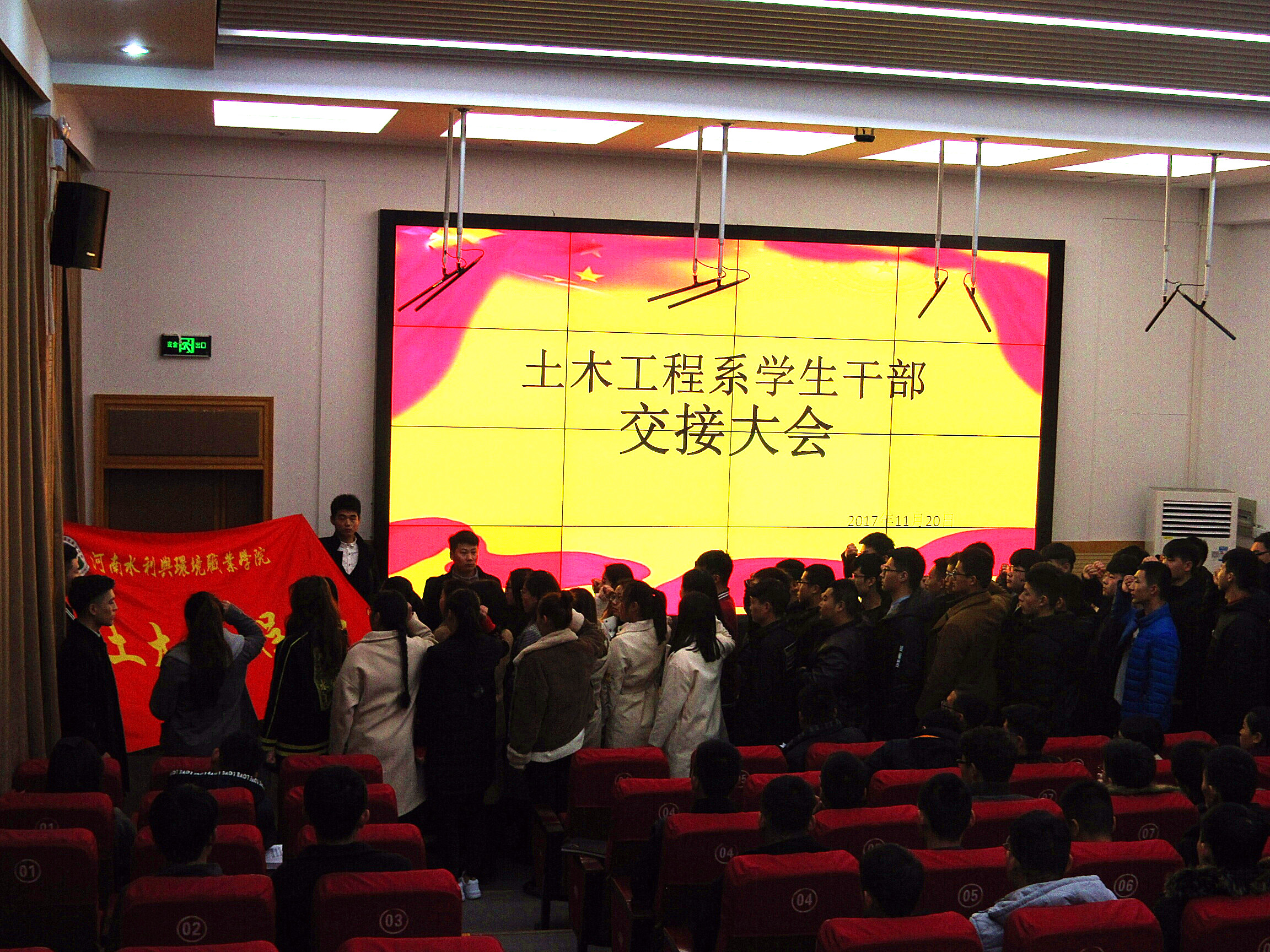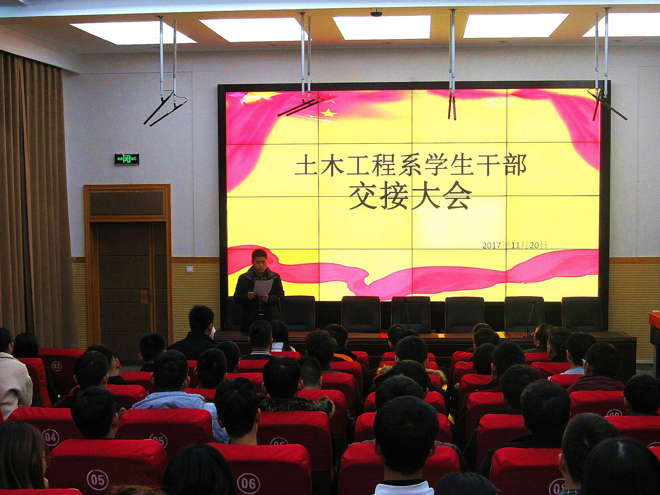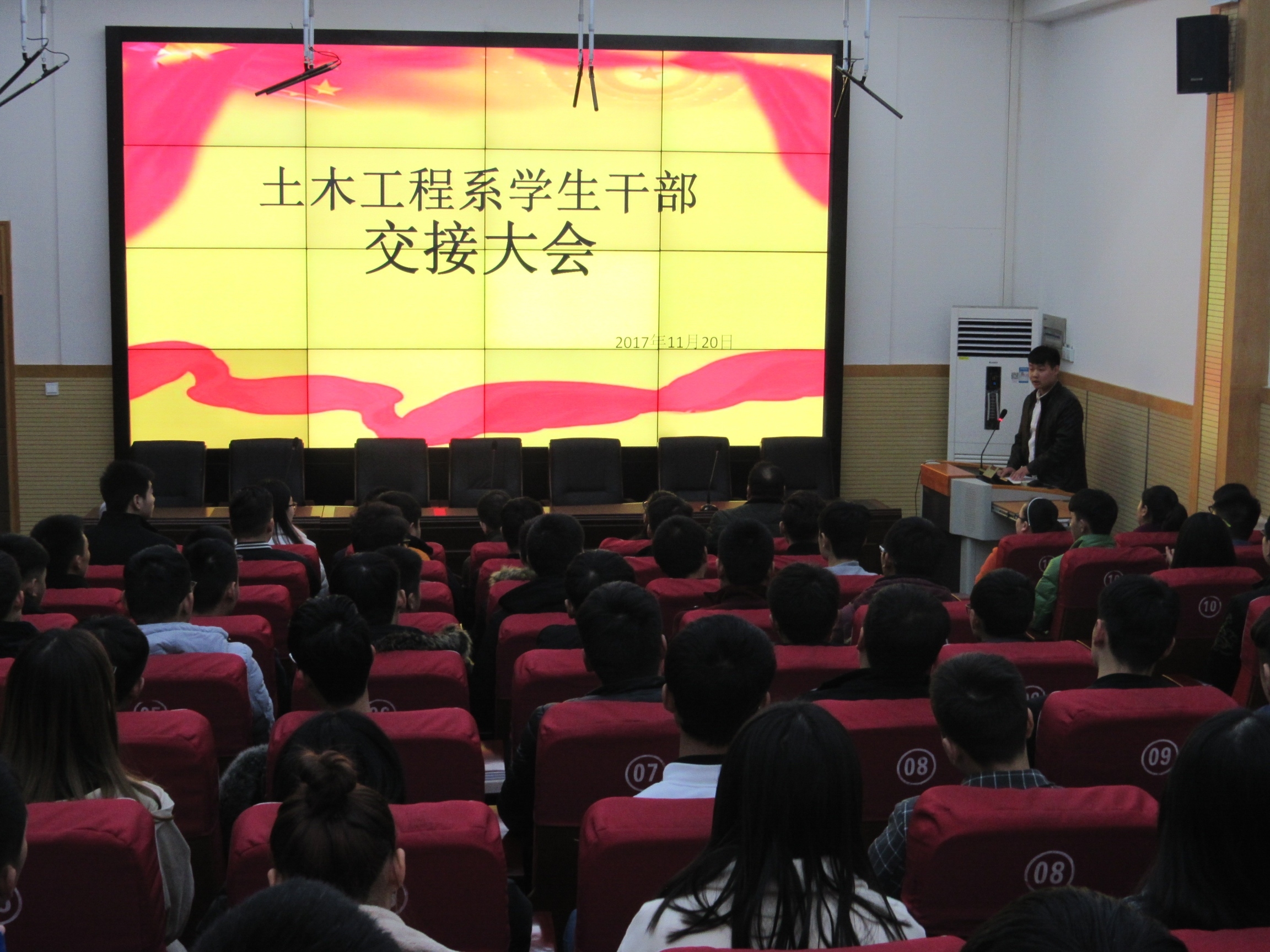 11月20日18:30,土木工程系在北教三阶举行学生干部交接大会,系党支部书记文琳、副主任钟含、团总支书记陈文,全体学管、辅导员老师及往届团学干部,各班班长、团支书参加大会。