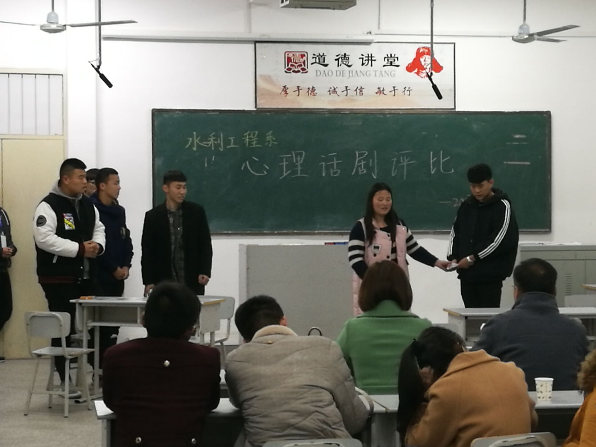 2017年11月20日晚7:00,水利工程系在综合楼408教室开展心理情景剧评比。此次活动是为我院举办的以“我的大学生活,我做主”为主题的第三届心理情景剧进行初选,共有10支队伍参赛,按抽签顺序进行表演。系党支部书记李文林,学管老师曾洒洒、焦玉茹担任评委。
