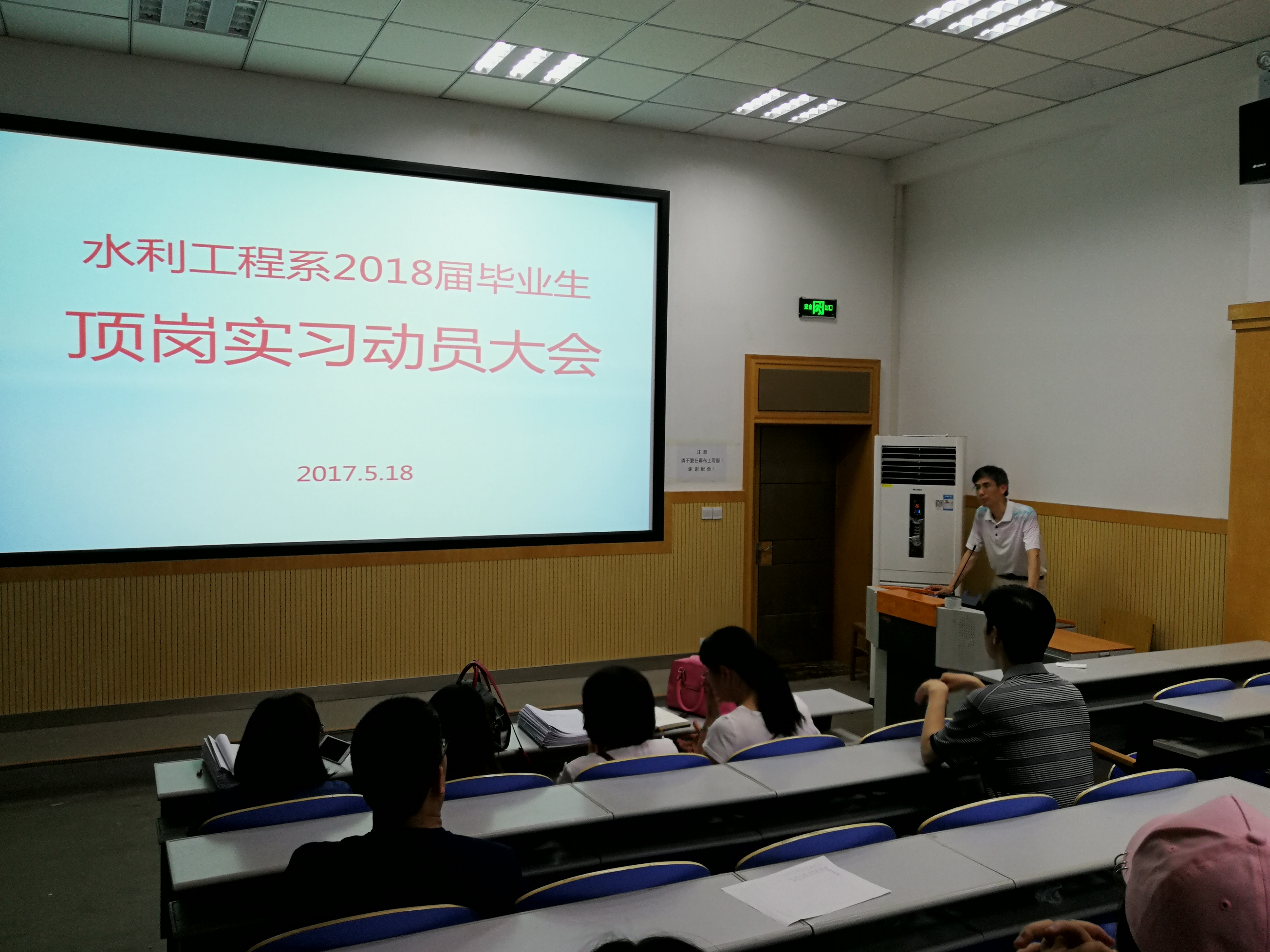 为进一步做好水利工程系毕业生顶岗实习和就业工作,贯彻落实我院《学生顶岗实习管理办法》文件精神。5月18日下午,水利工程系在北教学楼一楼阶梯教室召开2018届毕业生顶岗实习动员大会,系主任徐水平、党支部书记李文林、系副主任王建军、实习指导老师及各班辅导员参加。