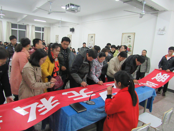 师生在“爱岗敬业 无私奉献”条幅上签名