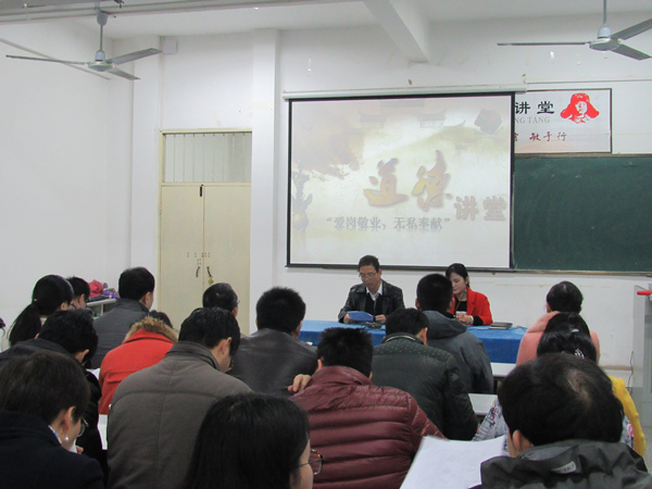 为了弘扬和传承中华传统美德,培育优秀大学文化,构建“崇德、尚善、文明、和谐”的校园环境,土木工程系于2015年11月17日在综合楼408教室举行了以“爱岗敬业,无私奉献”为主题的道德大讲堂活动。系党支部书记文琳、主任包永刚、副主任钟含,学管、辅导员老师以及学生代表参加活动。