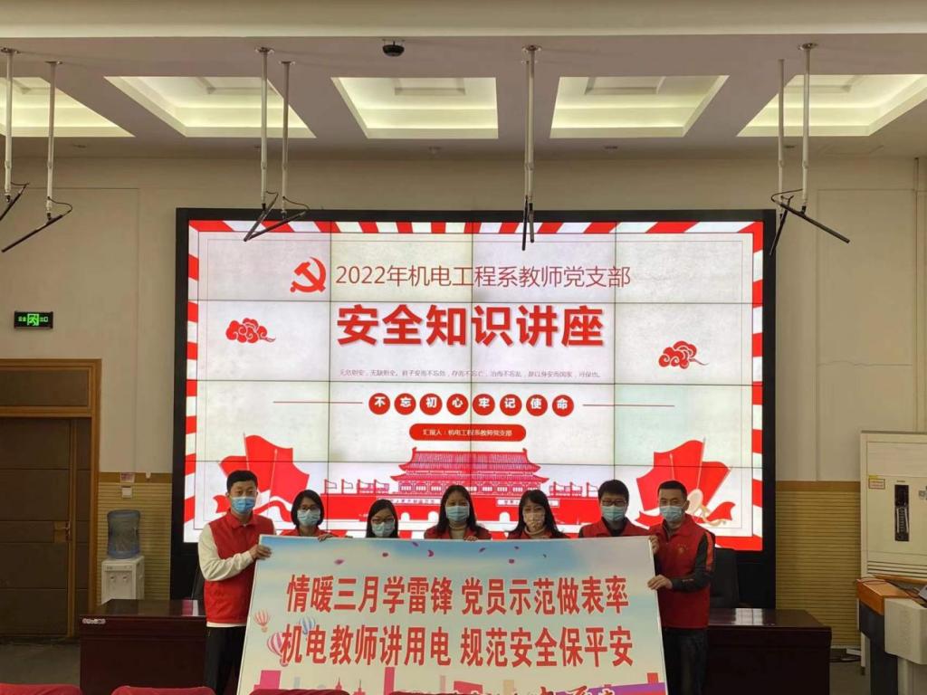 情暖三月学雷锋,党员示范做表率。3月30日,机电工程系教师党支部开展“机电教师来讲课,安全第一记心中”主题讲座。李戈、郑向歌、郑武强、赵驭阳四位老师主要围绕“防疫安全、用电安全、机械实训操作安全以及实验室管理规章制度”四个方面为学生做了精彩讲述。讲座内容详实,讲授幽默生动,现场气氛轻松活跃,获得了学生们的一致好评。