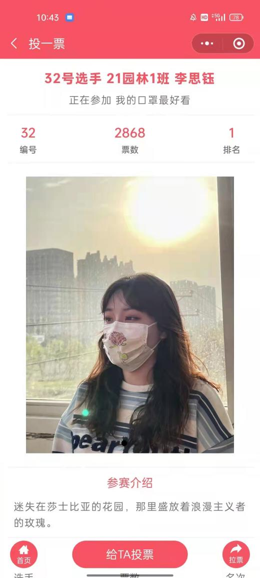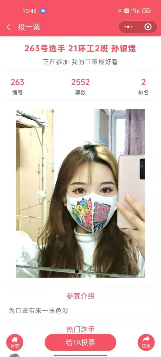 自3月16日起,环境工程系开展“我的口罩最好看”线上推选活动,全系学生积极参与。活动以“倡导科学佩戴口罩 树牢疫情防控意识”为主题,通过绘制口罩图案作品等,积极倡导大家养成戴口罩、讲卫生的良好习惯。经过为期3周的投票推选,最终评出一等奖1名、二等奖3名、三等奖5名。
