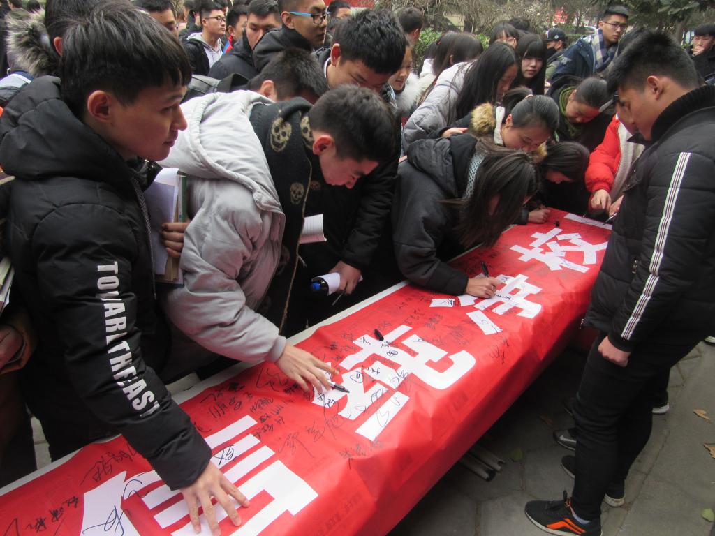 学生在条幅上签字承诺