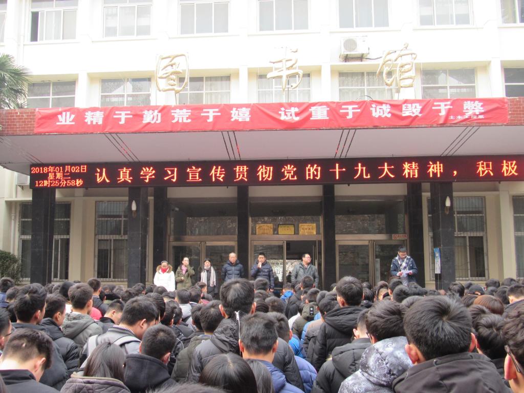 为加强大学生诚信教育,进一步严肃考风考纪,土木工程系于2018年1月2日12:20在图书馆前举行“诚信考试,杜绝舞弊”宣誓大会。系全体学管教师及2017级同学参加本次大会。