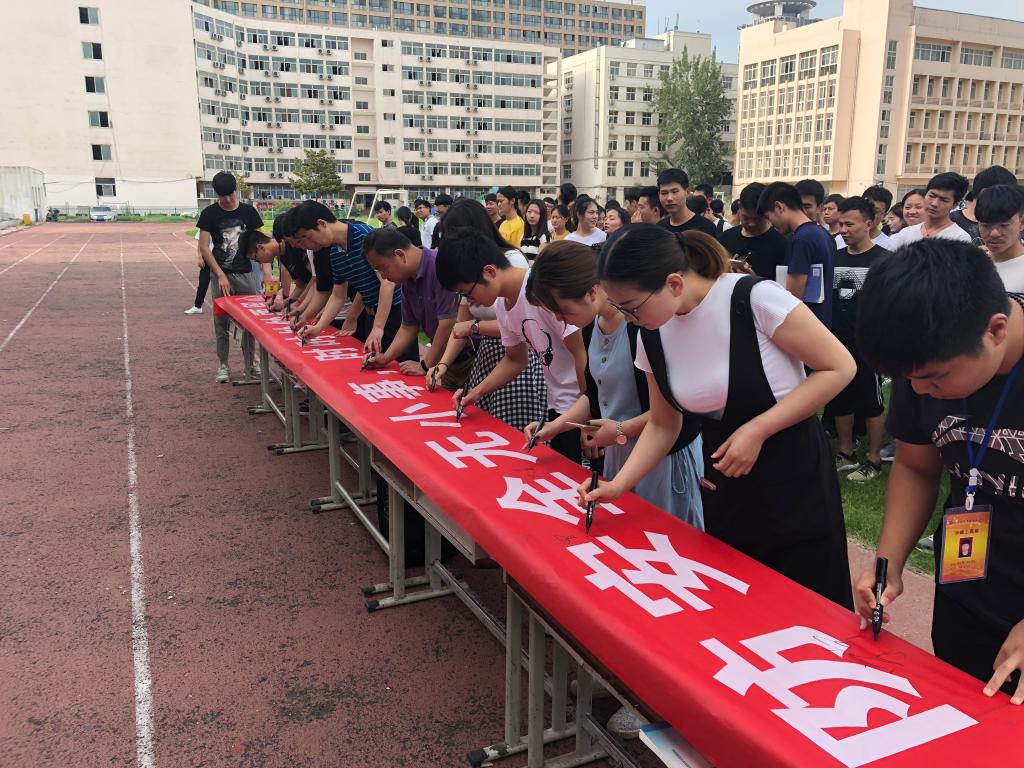 师生共同在条幅上签字承诺