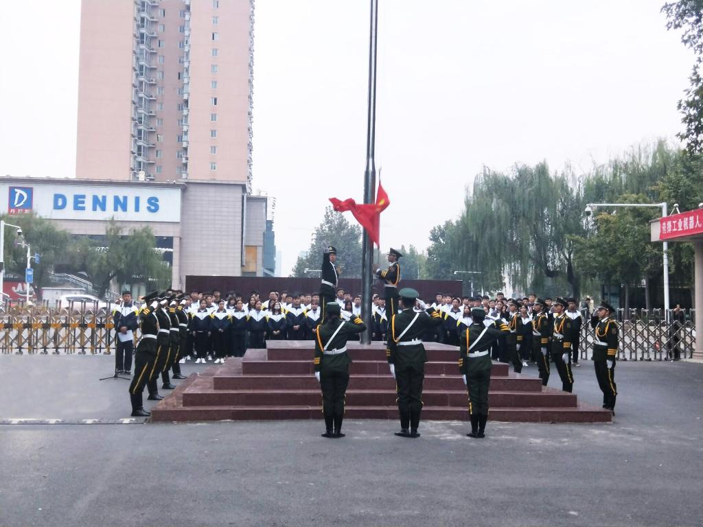 2018年10月15日,机电与信息工程系举行本学期第一次升国旗仪式,系全体学管老师和在校学生参加仪式。