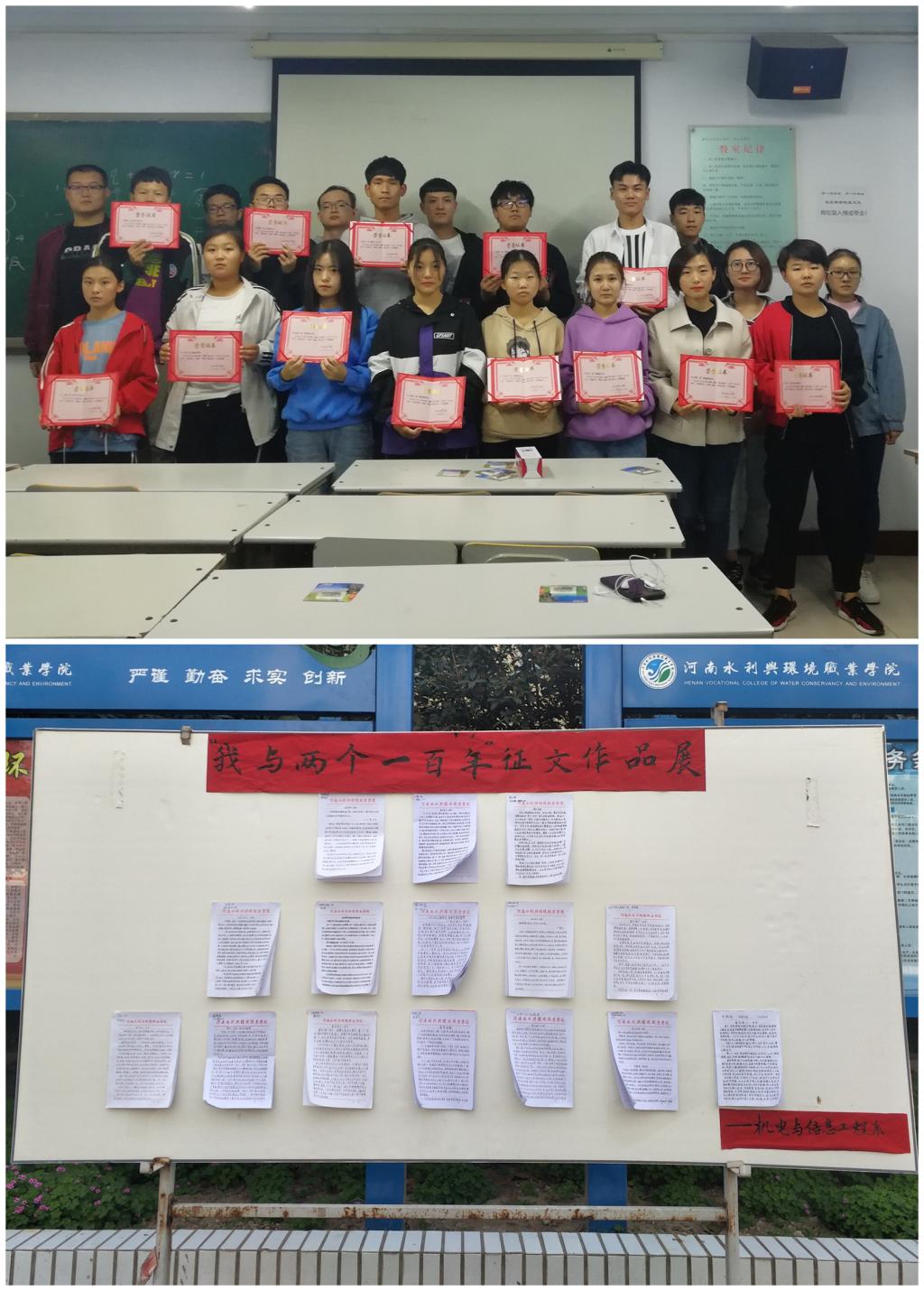 2018年10月15~23日,机电与信息工程系以“我与‘两个一百年’”为主题开展了征文活动。活动得到广大同学的热烈响应,参与学生达167名,最终评选出一等奖3名、二等奖5名、三等奖7名,优秀参与奖20名,并在校园内对获奖作品进行展览。