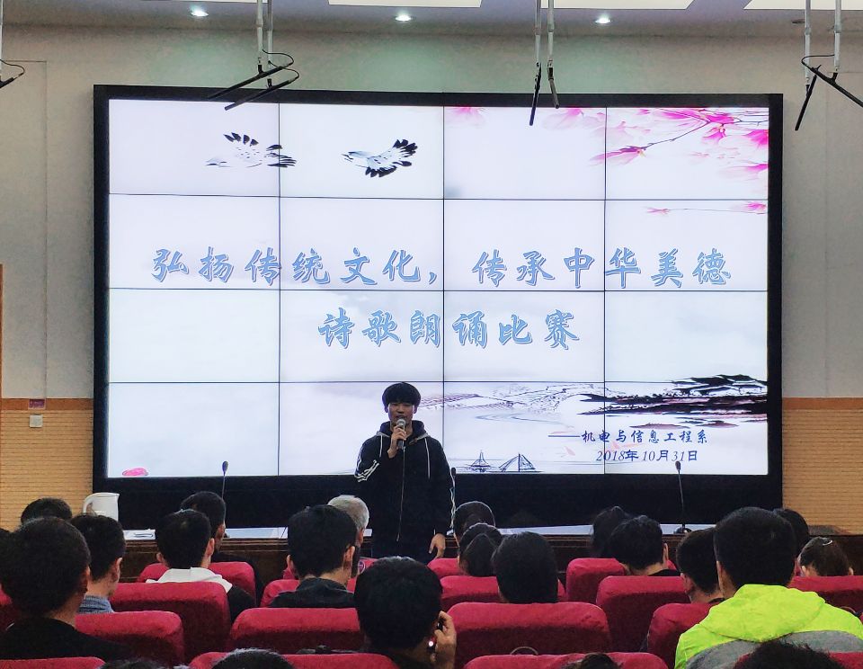 2018年10月31日,机电与信息工程系在北教三阶举办“弘扬传统文化,传承中华美德”诗歌朗诵比赛。比赛中,各位选手以饱满的激情充分展现了诗歌朗诵的艺术感染力,受到现场师生一致好评。